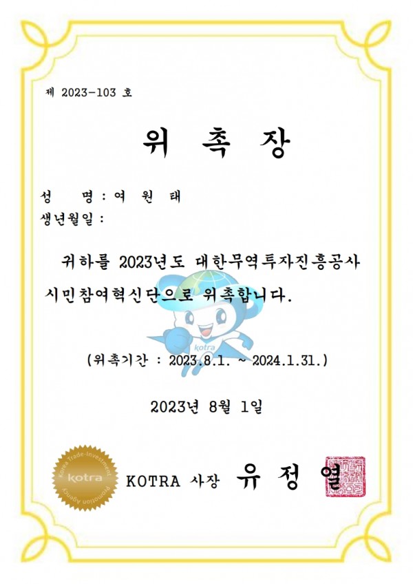 Letter of Appointment of KOTRA Citizen Participation Innovation Group 관련링크 mondereve 751 0 본문 Letter of Appointment of KOTRA Citizen Participation Innovation Group SHARE THIS PAGE 목록